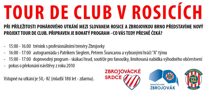 Duel se totiž hraje v rámci nově rozjetého projektu Tour de Club (více informací najdete v samostatném článku). Už v 15 hodin tak začíná ukázkový trénink mládeže s profesionálními trenéry ze Zbrojovky v čele s legendárním Patrikem Sieglem. Ten poté usedne za podpisový stolek (chybět nebudou ani kartičky s jeho podpbiznou k podpisu), po jeho boku se objeví třeba Petr Švancara - a také hráči Zbrojovky, kteří nebudou v zápasové nominaci. Už teď můžeme prozradit, že se bude jednat s určitostí o duo marodů Škoda - Ashiru.