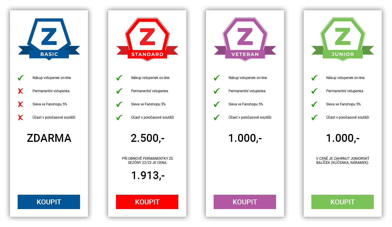 Ceny permanentek začínají na 1000 korunách (programy Veterán a Junior). Obnovenou permanentku na západní tribunu pořídíte za 1913 korun, novou za 2500 korun. Jeden zápas tak pořídíte v návaznosti na věrnostní program a kategorii za 66 korun (obnovené Veterán a Junior), 127 korun (obnovená Standard) či za 166 korun (nová permanentka).