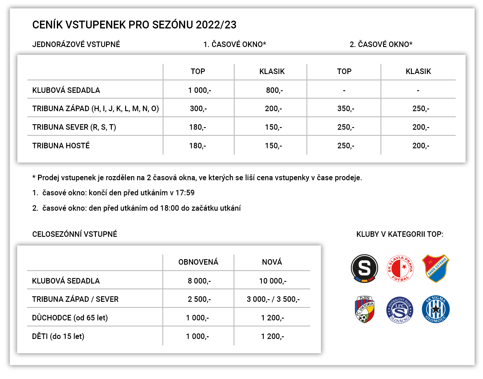 V ceně celosezónních permanentek a klubových sedadel jsou i domácí pohárové a přípravné zápasy a také duely nadstavbové části FORTUNA:LIGY.