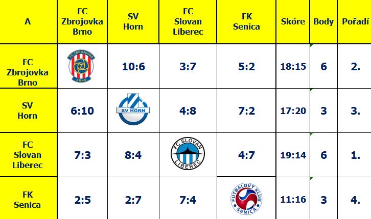 Na úvod nedělního programu porazil rakouský Horn Senicu, čímž zamotal situaci ve skupině A a zajistil tím zároveň postup Zbrojovce. Ta v závěrečném utkání podlehla Liberci 3:7, když se zápas lámal v úvodu druhé půle. Brňané nevyužili ani své největší šance, zatímco Liberec byl efektivnější a celkově dobrý výkon podpořil navíc skvěle chytající gólman.