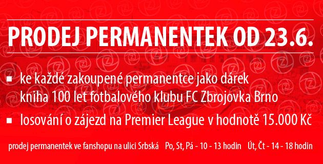 Ten se pro zdravotní problémy nemůže zúčastnit soustředění v Uherském Brodě, otestuje si tak i mimofotbalové dovednosti. K permanentce vám dá také slíbený dárek, kterým je rozsáhlá kniha 100 let fotbalového klubu FC Zbrojovka Brno (v hodnotě 490 Kč). Připomínáme, že majitel nové permanentky bude navíc zařazen do slosování o letecký výlet (se vším všudy v celkové hodnotě 15 000 Kč) na anglickou Premier League. Los proběhne na některém domácím zápase v úvodu sezony.