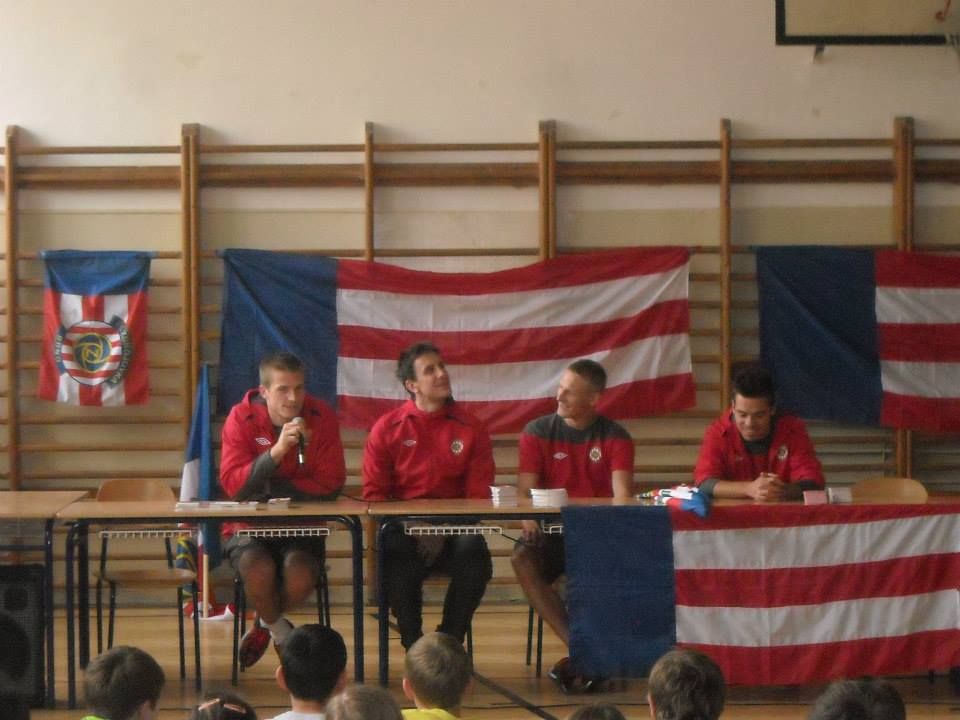 Zbrojovku zde reprezentovali Václav Hladký, Martin Sus, Michal Škoda a Petr Buchta. Ze začátku se děti jaksi neměly k tomu, aby kladly otázky a tak musel zaskočit jeden z kantorů. „Jak jste oslavili vítězství nad Spartou?“ zněl dotaz. Jako první se chopil mikrofonu Petr Buchta a s kamennou tváří náčelníka Apačů ze sebe vysoukal: „Dali jsme si tři koly,“ ale pak mu začaly koutky cukat smíchem. Bokem mimo mikrofon pak utrousil, že Sparta se neporáží každý den a že tedy nějaká oslava proběhla. Nutno podotknout, že to byla oslava legální, hráči dostali na čtvrtek volno a večer po Spartě tedy mohli „na jedno“.