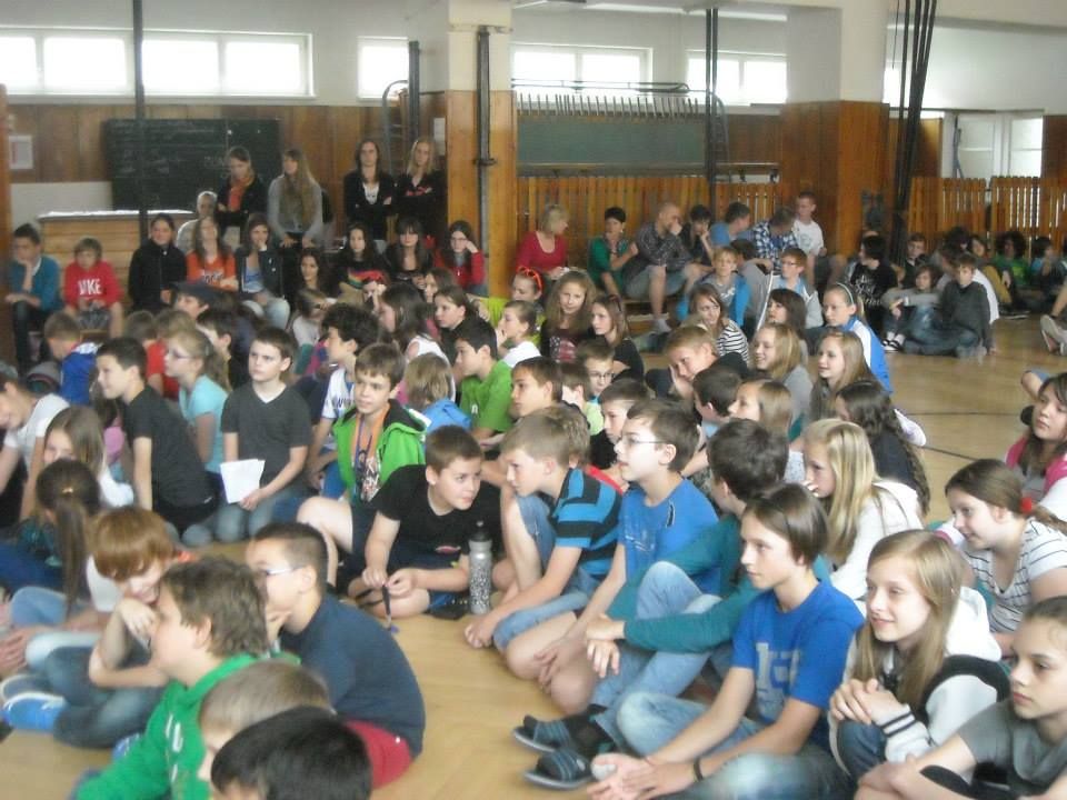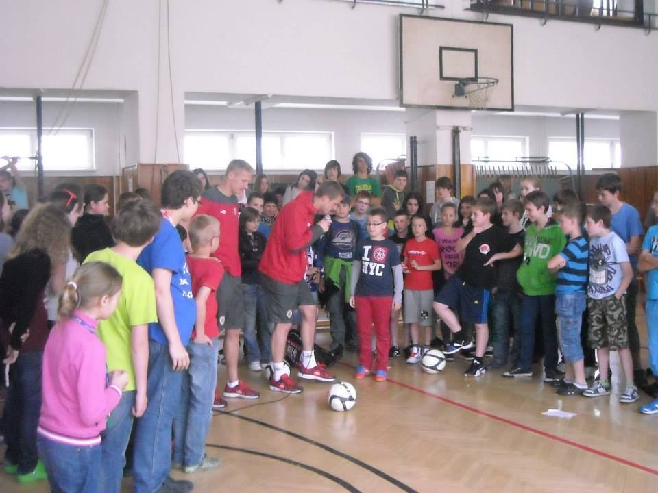 Zcela vážný dotaz vznesl jeden žák: Kdy už konečně budete mistry? Petra Buchtu to ale vůbec nevyvedlo z konceptu a s rutinou zkušeného moderátora odpověděl: „Příští rok, teď jsme tak krásně rozjetí,“ rozesmál publikum a vysloužil si za to potlesk na otevřené scéně. Ten pak sklidil i Vašek Hladký za deset „trestných“ kotrmelců. Vsadil se totiž s žákem jménem Kryštof, že když se trefí míčem přesně do středního terče, udělá gólman právě deset kotoulů.